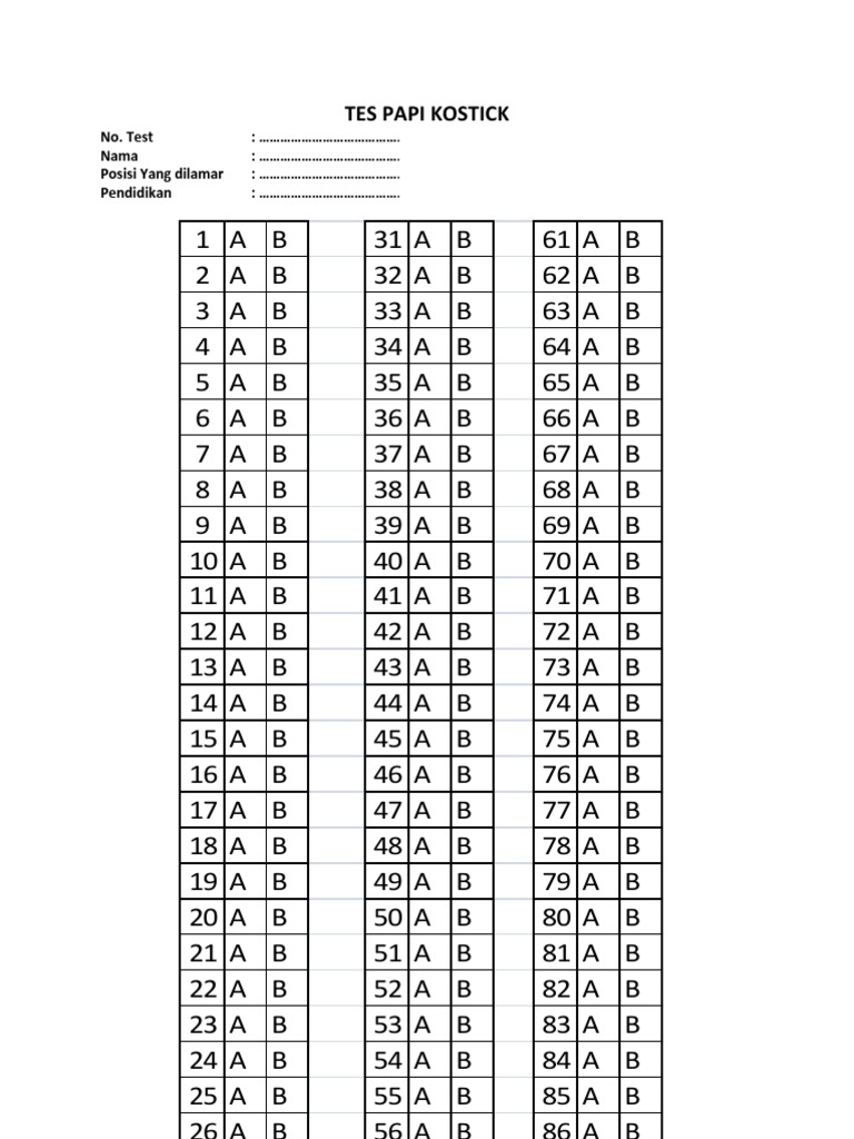 Jual Alat Tes Papi Kostik Kostick Alat Tes Psikologi Kepribadian Personality Software Skoring Tes Psikotes from softwarepsikotes.id We did not find results for: Maybe you would like to learn more about one of these? Check spelling or type a new query.